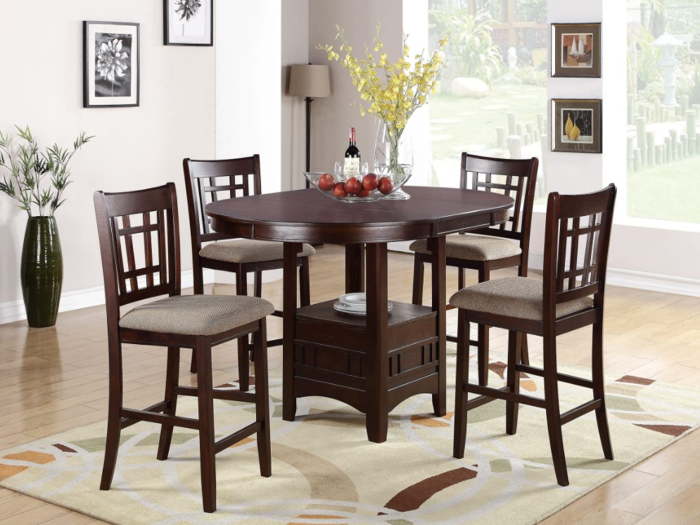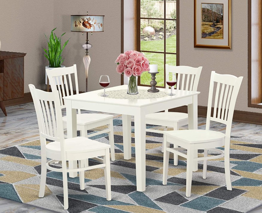Ciri khas dari model yang satu ini adalah bentuk meja bulat-bulat. Penggunaan material kayu akan memberikan kesan natural tetapi tetap mewah. Gunakan perpaduan warna lain pada kursi, seperti hitam atau biru tua. Cocok sekali untuk keluarga kecil dan rumah minimalis.