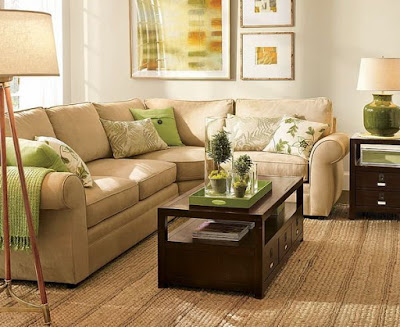 Desain perpaduan warna ini bagus untuk ruangan ukuran tidak terlalu luas. Pilih warna netral pada sofa sehingga kontras dengan dinding, seperti coklat muda. Tambahkan aksesoris ruangan berupa pajangan foto, lukisan, partisi berisi ornament seni kriya unik, dan karpet bulu berwarna senada dengan kursi.