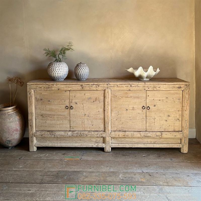 Bufet ini hadir dengan desain vintage yang simpel dan elegan, memadukan warna alami kayu yang memberi kesan hangat dan autentik. Dengan dua pintu besar yang memberikan ruang penyimpanan yang luas, cocok untuk menambah sentuhan klasik pada ruang tamu atau ruang makan Anda.