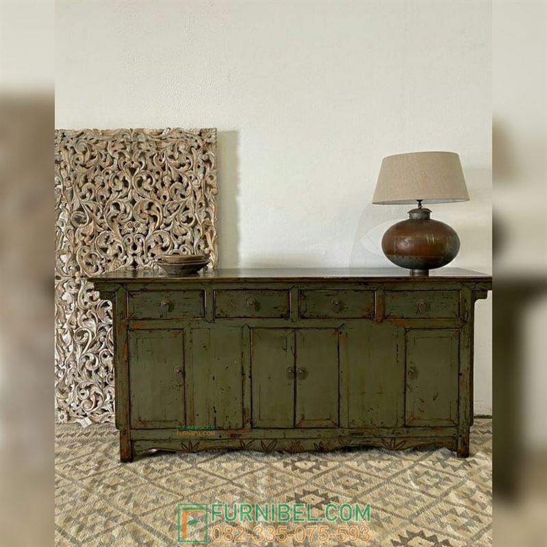 Buffet ini menawarkan desain vintage klasik dengan finishing kasar yang unik. Dengan warna hijau yang sudah sedikit pudar, memberikan kesan antik dan elegan. Dilengkapi dengan beberapa laci dan pintu yang luas, cocok digunakan untuk penyimpanan atau hanya sekedar dekorasi ruangan.