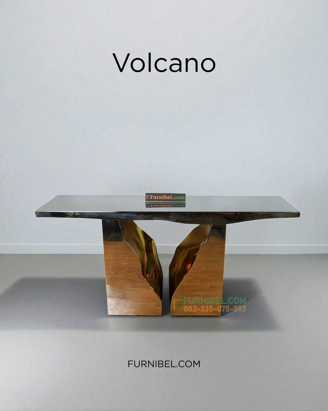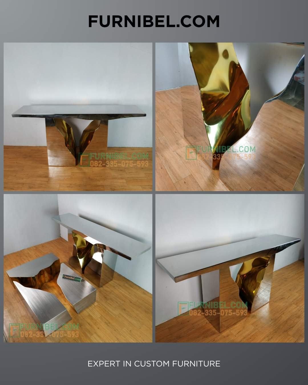🌀 Meja Konsul Unik & Artistik – Ukuran 120x45x85 cmTampilan tidak biasa dengan bentuk nyentrik dan kombinasi batu dan stainless.